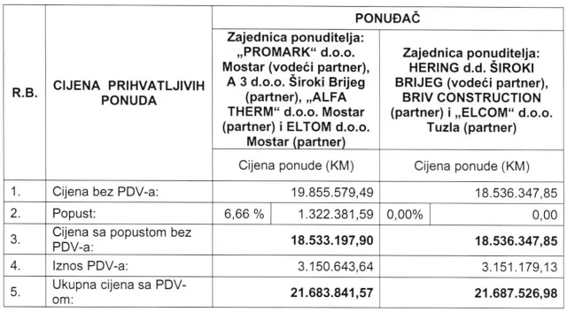 Zanimljivo je da je ova ponuda bila najniža, odnosno iznosila je 18.536.347 KM bez PDV-a, dok je cijena pobjedničkog konzorcija bila 19.855.579 KM.