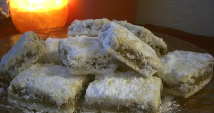 Na to rasporedite pripremljeni nadjev, pa prekrijte drugim, tanko razvaljanim dijelom tijesta. I ovaj sloj lagano izbockajte i vratite sve zajedno u rernu na još oko 15 minuta. Kad kolač izvadite iz rerne, dok je još vruć, režite ga na male kockice (otprilike 2×2 cm) i uvaljajte u šećer u prahu. Upravo te vruće, nježne kockice u šećernom oblaku čine ovaj kolač tako posebnim.