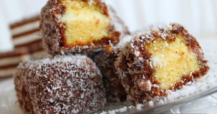 Isijecite biskvit na kocke. Svaku kocku umočite u mlaku glazuru, pa odmah uvaljajte u kokosovo brašno.
