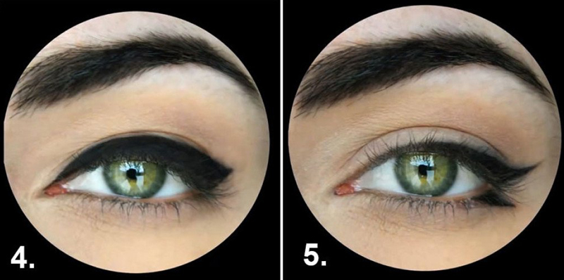 Tušem iscrtajte i spojite završetak oka s tačkicom. Nakon toga krenite s iscrtavanjem linije od sredine oka uz sam korijen trepavica. Drugim slojem liniju počnite podebljavati od druge trećine oka prema kraju sve dok se savršeno ne stopi s prvobitno iscrtanom linijom pod kutom.