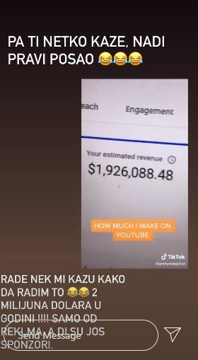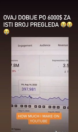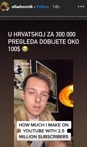 Riječ je o prosječnoj zaradi jutjubera. Ona je to objasnila jednim kratkim video snimkom u kojem momak objašnjava da u Americi jutjuberi za 300.000 pregleda dobijaju 6.000 dolara, a potom ona tvrdi da se za isti broj pregleda u Hrvatskoj zaradi oko 100 dolara.