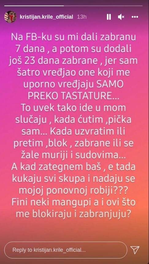 Kristijan Golubović oglasio se na svom Instagram nalogu i otkrio da je dobio zabranu od strane Fejsbuka. Poznato je da Kristijan često prijeti, psuje i vrijeđa na društvenim mrežama, te nije ni čudno što ga je Fejsbuk suspendovao.