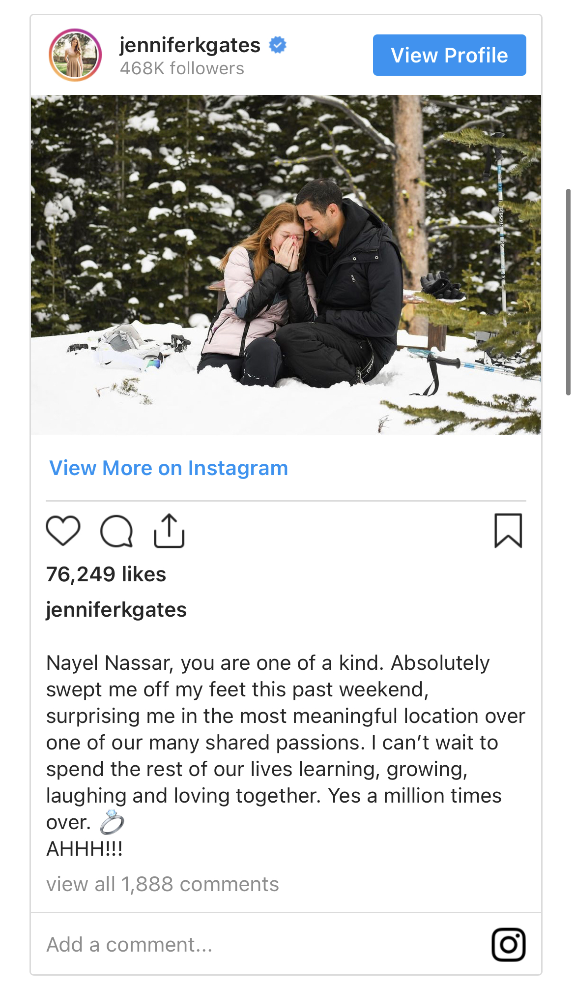 Zaruke su se odvile prilikom zajedničkog odlaska na skijanje, a Jennifer je povodom ovog trenutka objavila dvije fotografije sretnog događaja uz opis: “Nayel Nassar, ti si jedan i jedinstven. Ne mogu dočekati da provedemo ostatak života zajedno u ljubavi, rastući i smijući se. Milion puta da!”