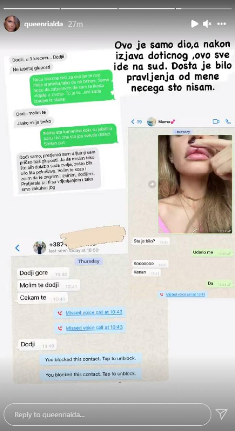 -S obzirom na to da se “prijeti” nekim snimkom, ja apelujem da se pusti u eter, pa da se makar istina zna. Ja ne znam šta se tačno radi kada te dečko vrijeđa najgore moguće (tako mjesecima), pa kad odgovoriš uvredom i onda te pljune (bukvalno) po sred lica? A onda vjerovatno treba da se šuti na to, sudeći po komentarima. Ja neću da pričam o porukama, glasovnim i slikom rascijepljene usne u telefonu, ali ako treba nije problem – napisala je Rialda, a potom i objavila sve o čemu je govorila.