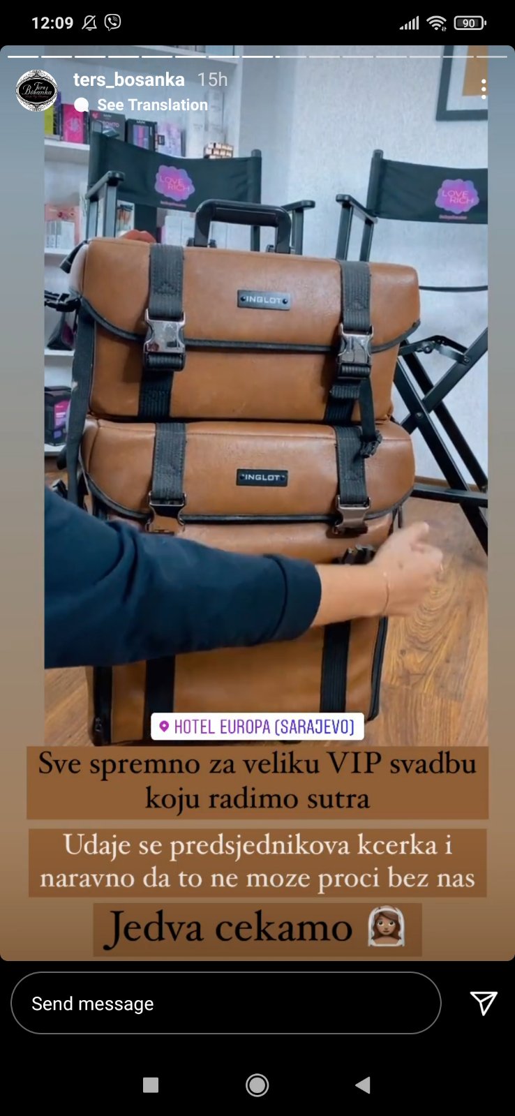 Merjem Nuhić, na društvenim mrežama poznatija kao „Ters Bosanka“, na svom Instagram profilu objavila je nekoliko storyja. Naime, ona će šminkati Jasminu Izetbegović, kćerku Bakira i Sebije. Sve je spremno za današnju svadbu, na kojoj je pozvano nekoliko stotina zvanica, uključujući i turskog predsjednika Erdogana koji je stigao danas u Sarajevu.