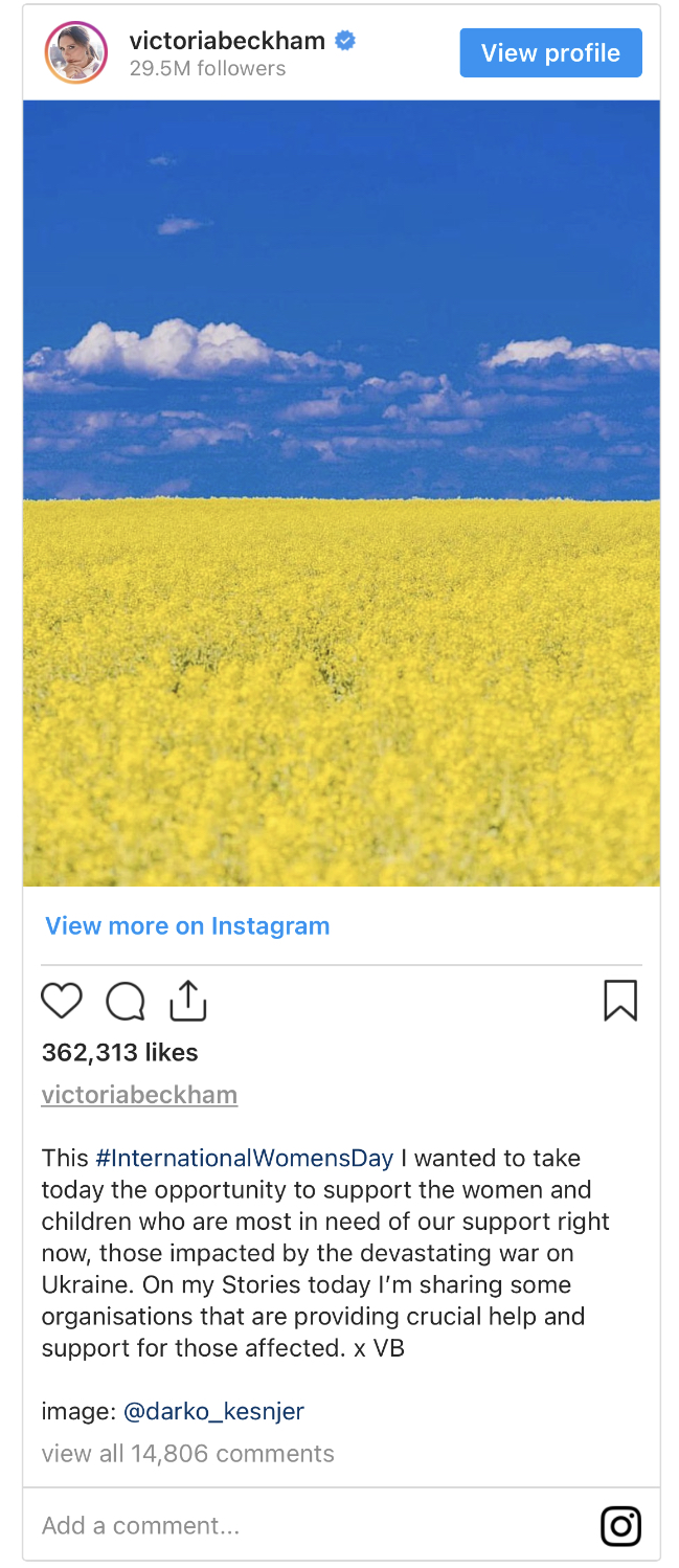 Victoria Beckham je na svom Instagram profilu objavila fotografiju snimljenu u okolini Vukovara kako bi pružila podršku Ukrajini u jeku ruske agresije.