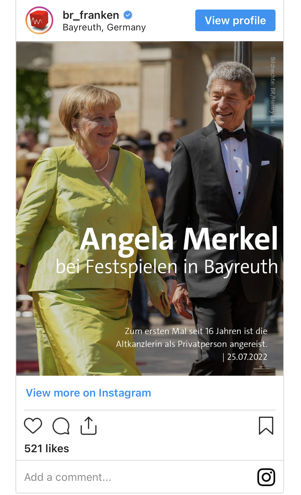 Njemačka kancelarka 16 godina je bila na toj funkciji, a svoj privatni život je uspjela sačuvati od očiju javnosti. Njen suprug Joachim Sauer uglavnom bježi od svjetala pozornice (razgovore s medijima kategorički odbija), a iznimka su jedino redovna posjećivanja Bayereuth Festivalu. Danas su zajedno prošetali crvenim tepihom na temperaturi od 35 stepeni držeći se za ruke, a izmijenjivali su i zaljubljene poglede.