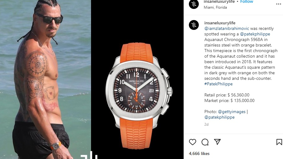 “Zlatan Ibrahimović je nedavno primijećen kako nosi sat Patek Philippe Aquanaut Chronograph 5968A od nehrđajućeg čelika s narandžastom narukvicom.