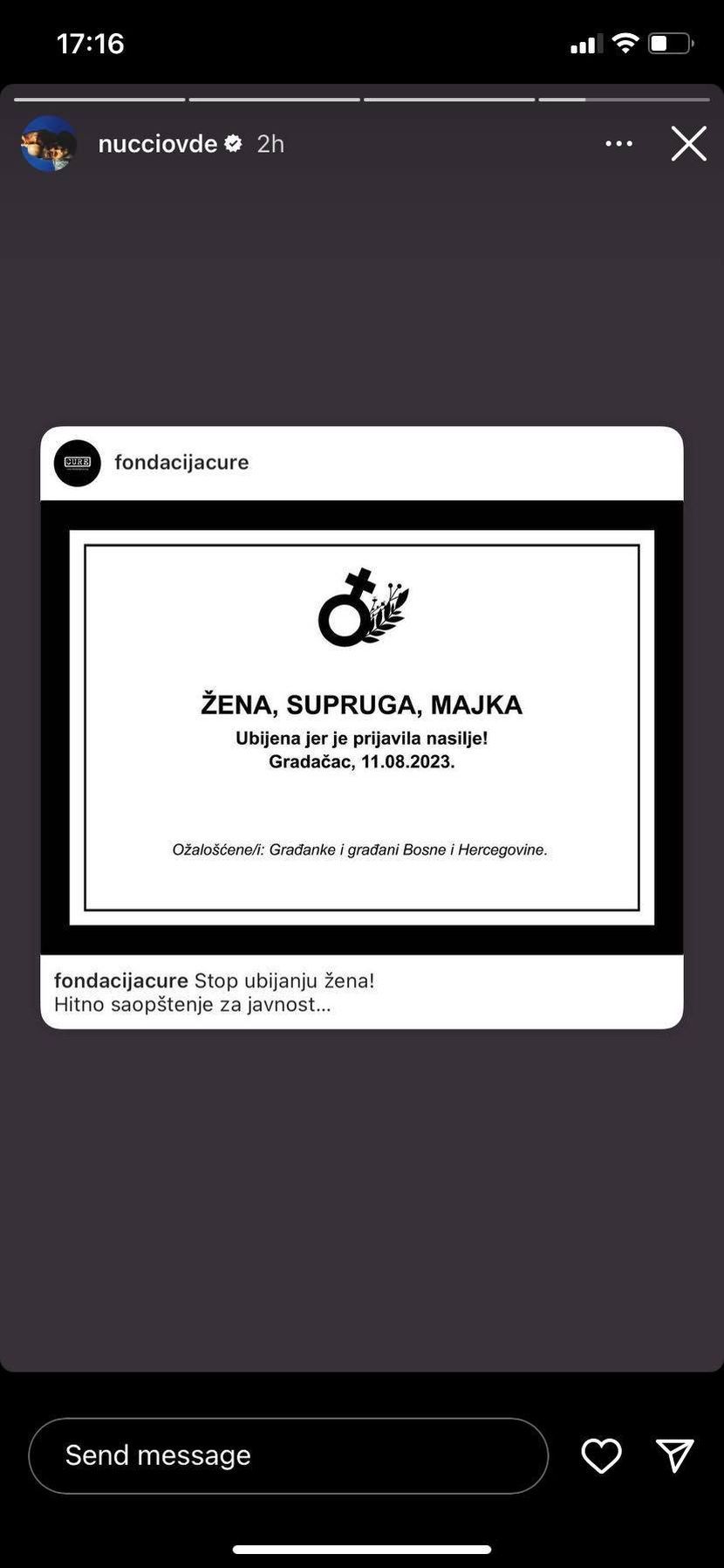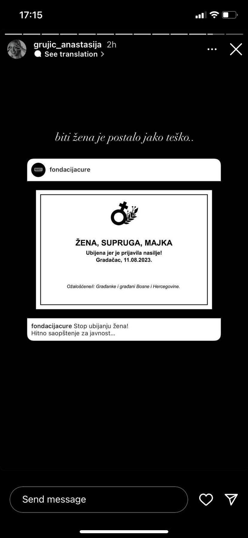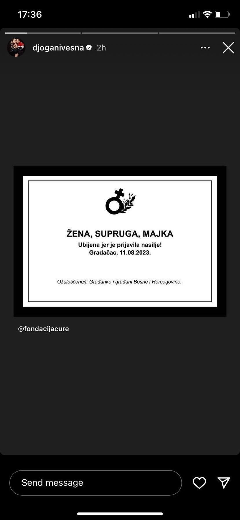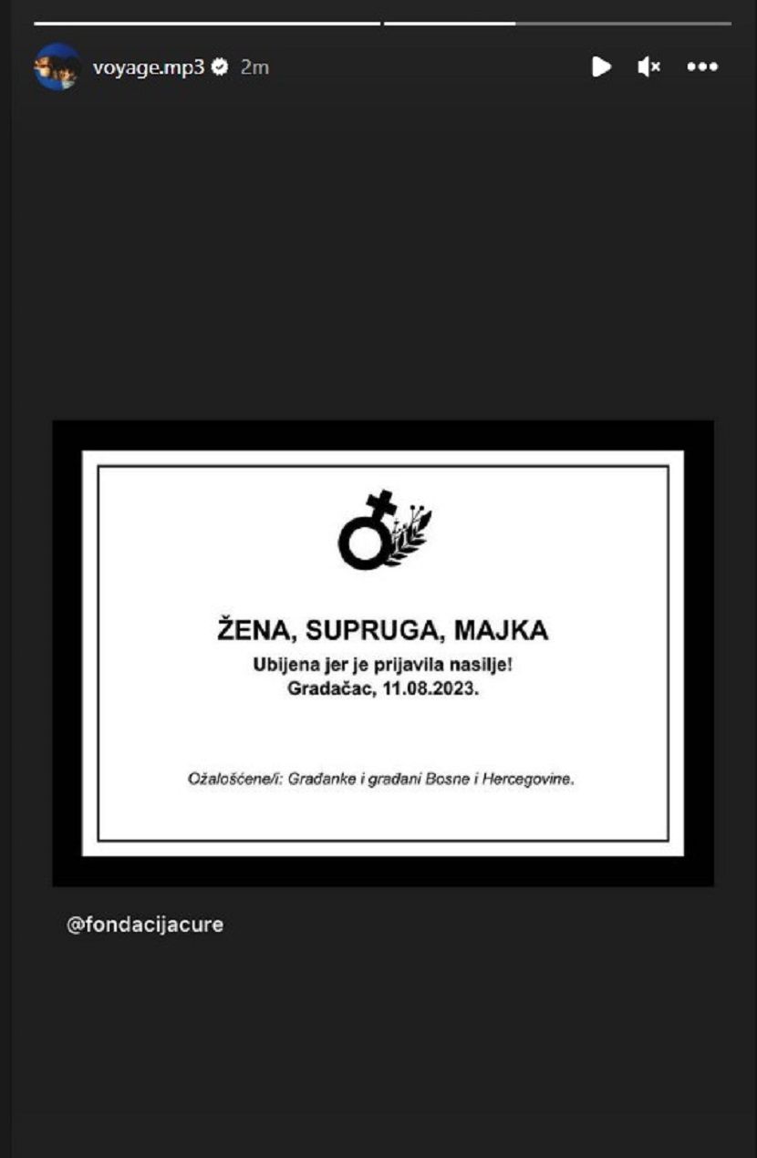 - Žena supruga, majka, ubijena jer je prijavila nasilje. Gradačac, 11.8.2023. Ožalošćeni: građani i građanke Bosne i Hercegovine – piše u objavi koja se masovno dijeli, a koja je osvanula i na profilu repera Mihajla Veruovića Vojaža i Nućija, pjevačice Vesne Đogani, blogerke Anastasije Grujić.