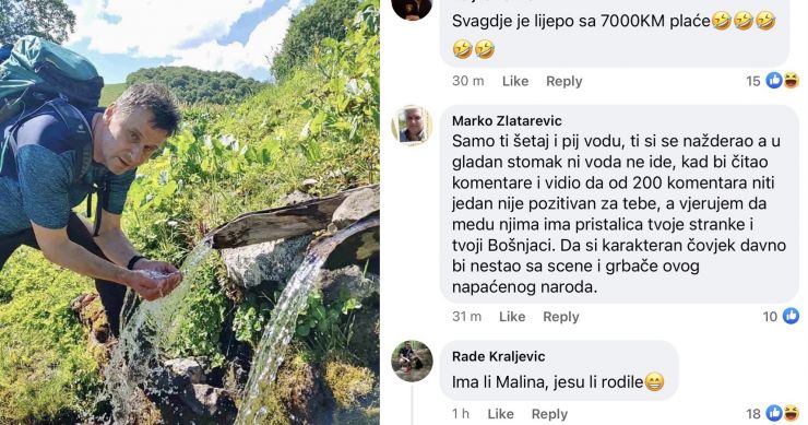Naime, premijer Novalić je na svom Facebook profilu objavio fotografiju iz jedne od svojih šetnji prirodom. Na fotografiji se Novalić, u sportskoj opremi i s ruksakom na leđima, saginje kako bi se napio vode iz izvora.