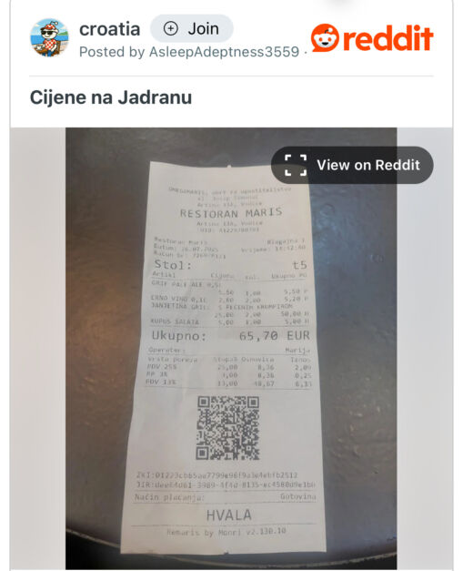 Jedan turista koji je podijelio svoj račun iz Vodica na Redditu ostao je zbunjen cijenom salate od kupusa i to nakon što je platio 50 eura (oko 100 KM) za janjetinu i 2 dcl crnog vina 5,20 (oko 10 KM).
