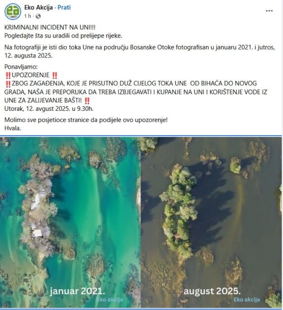 Facebook stranica Eko Akcija jutros je objavila usporedne fotografije toka rijeke Une kod Bosanske Otoke, snimljene u januaru 2021. i augustu 2025. godine, uz tvrdnju da je riječ o “kriminalnom incidentu” i pozivom građanima da izbjegavaju kupanje i korištenje vode iz Une zbog, kako navode, ozbiljnog zagađenja duž toka od Bihaća do Novog Grada.