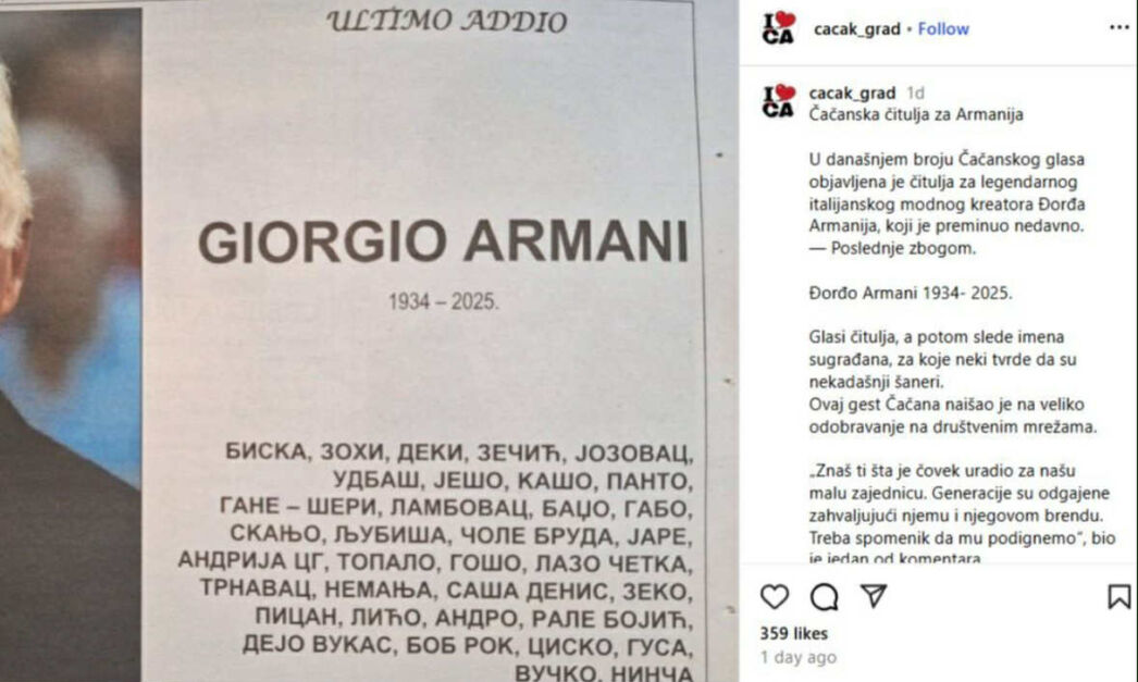 U Čačanskom glasu objavljena je smrtovnica legendarnom italijanskom modnom dizajneru Đorđu Armaniju (Giorgiju), a korisnike društvenih mreža nasmijao je jedan detalj – potpisali su je nekadašnji preprodavači odjeće.