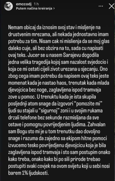 On je naveo da inače ne iznosi svoje stavove javno, ali da ga je prizor kojem je svjedočio duboko potresao i naveo da se oglasi. Kako ističe, u trenutku kada je nastao haos, djevojčica je, teško povrijeđena i zaglavljena ispod tramvaja, dozivala pomoć.