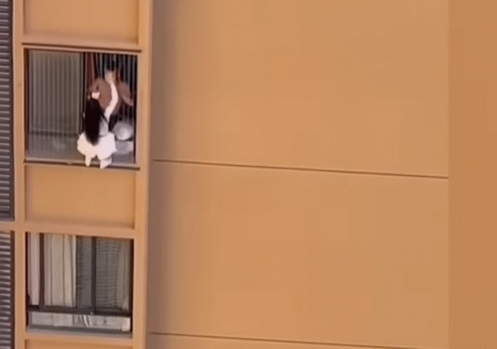 Kamere su zabilježile trenutak kada navodna ljubavnica, pokušavajući da se sakrije od žene svog ljubavnika, visi sa balkona na desetom spratu zgrade u Kini Komšije su sa užasom posmatrali...