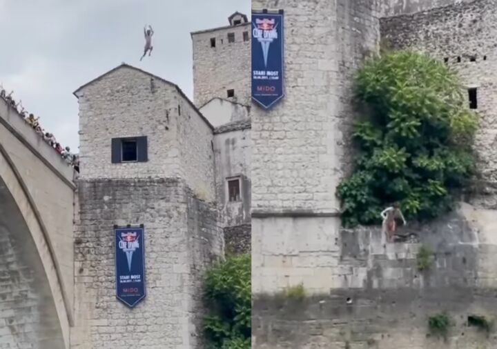 Video je objavljen na Facebook stranici "Mostaru moj info" , a prikazuje pripreme pred takmičenje Red bull cliff diving u Mostaru Jedan od takmičara Gary Hunt skočio je sa kule Tara na Starom...