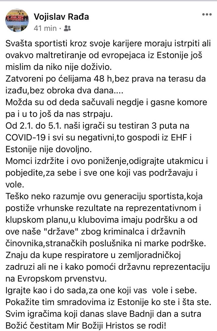 To gospodi iz EHF-ai Estonije nije dovoljno. Momci, izdržite i ovo poniženje, odigrajte utakmicu i pobijedite, za sebe i sve one koji vas podržavaju i vole – napisao je između ostalog Vojislav Rađa.