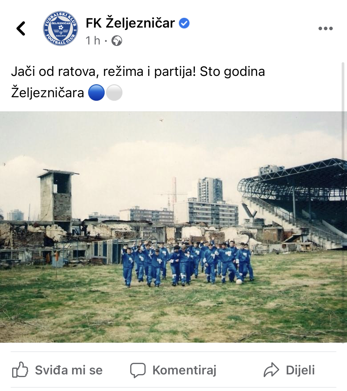 “Jači od ratova, režima i partija! Sto godina Željezničara”, poruka je Plavih uz fotografiju ratom razorene Grbavice.