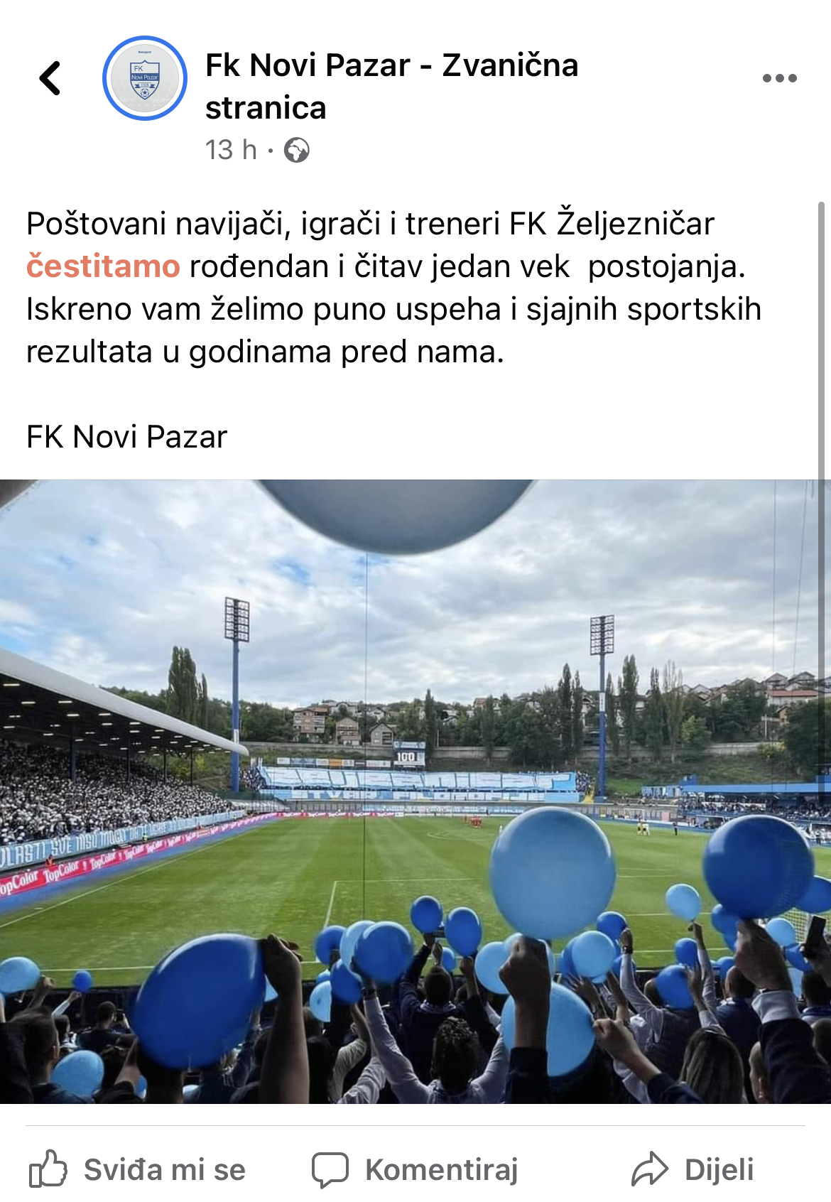 Stoti rođendan je Željezničaru sinoć, sa malim zakašnjenjem, čestitao i Fudbalski klub Novi Pazar iz Srbije.