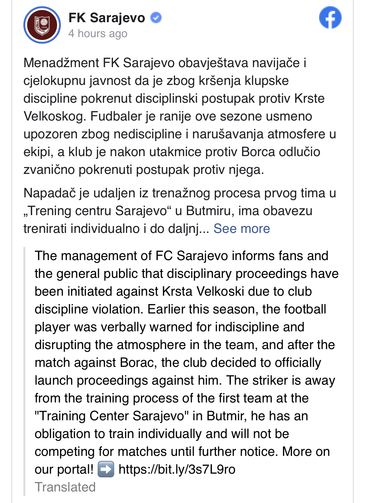 Menadžment FK Sarajevo obavijestio je navijače i cjelokupnu javnost da je zbog kršenja klupske discipline pokrenut disciplinski postupak protiv Krste Velkoskog, navodi se na zvaničnoj stranici kluba.