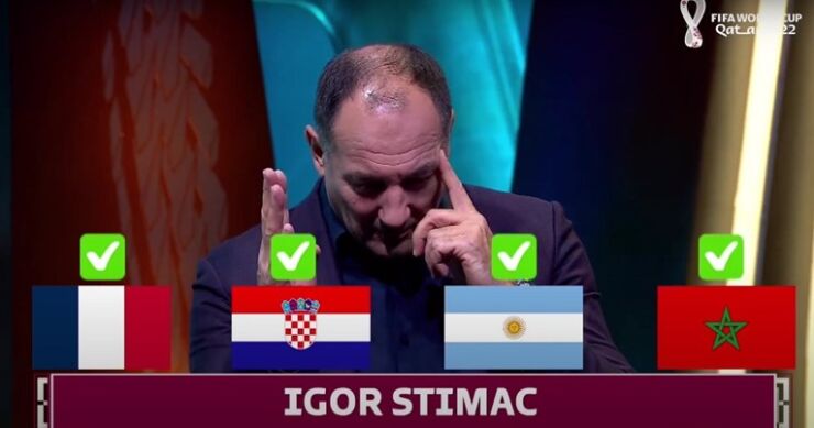 NEKADAŠNJI izbornik hrvatske reprezentacije Igor Štimac pogodio je u emisiji na kanalu Sports 18 sve sudionike polufinala Svjetskog prvenstva. S njim su u studiju pogađale nogometne legende Wayne Rooney, Luis Figo, Robert Pires i Sol Campbell, no jedini je Štimac pogodio sve. Polufinalisti su se predviđali još dok je trajala grupna faza.