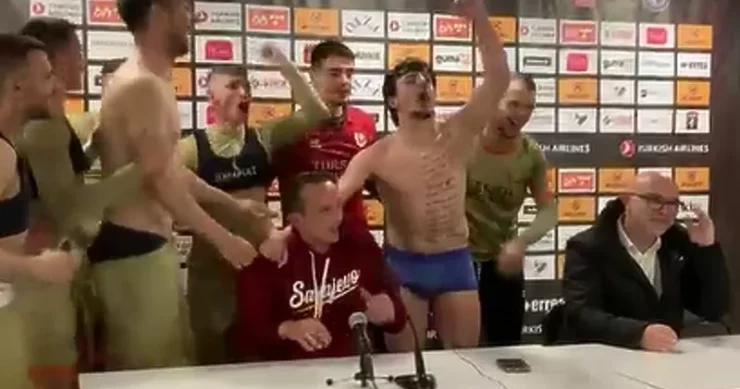 Nakon meča trener Mirza Varešanović se obraćao predstavnicima sedme sile, a onda su u press salu uskočili njegovi puleni koji su skupa sa njim pjesmom proslavili zlata vrijedan trijumf.