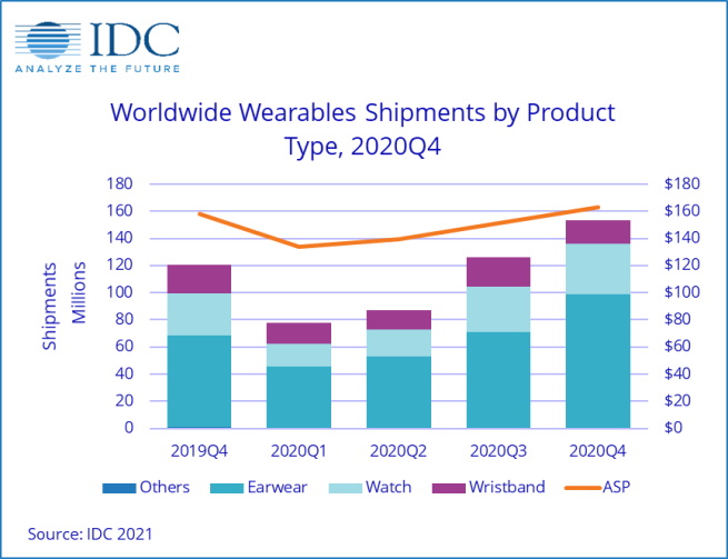 Analitička kompanija IDC izvještava da je isporuka nosivih uređaja zabilježila rast na 153,5 miliona u posljednjem kvartalu 2020. godine, što predstavlja povećanje od 27,2% u odnosu na isti period godinu dana ranije. Rast na godišnjem nivou je sličan, s ukupnom isporukom od 444,7 miliona uređaja.