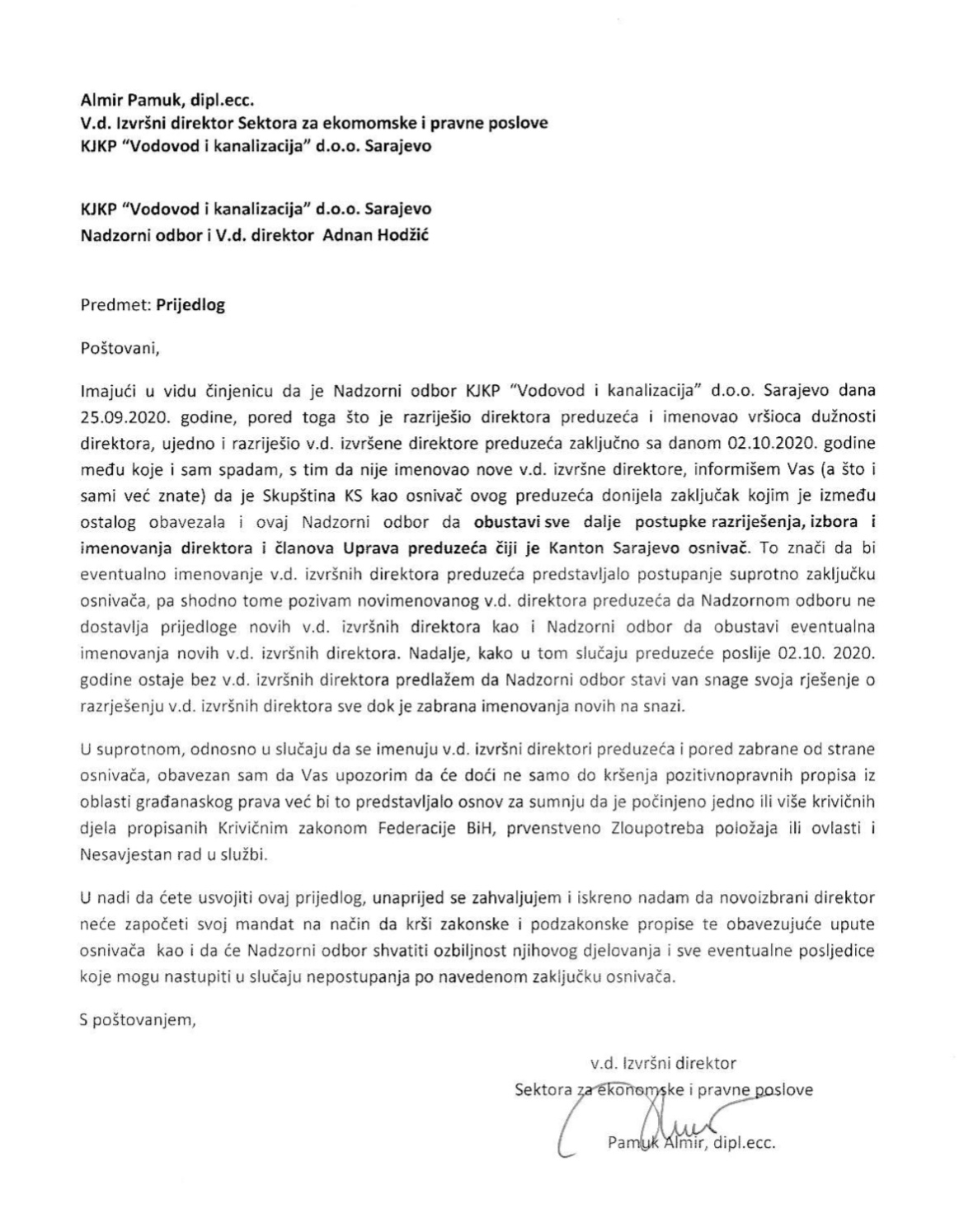 Almir Pamuk v.d. izvršni direktor Sektora za ekonomske i pravne poslove KJKP Vodovod i kanalizacija uputio je pismo upozorenja Nadzornom odboru i novoimenovanom v.d. direktoru ovog preduzeća Adnanu Hodžiću.