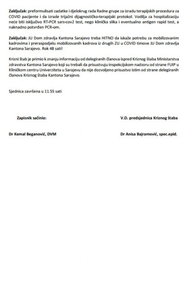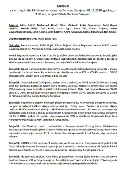 Krizni štab je upoznat da članovima ispred Kriznog štaba Ministarstva zdravstva KS koji su trebali prisustvovati inspekcijskom nadzoru od strane Federalne uprave za inspekcijske poslove u KCUS-u nije dozvoljeno prisustvo (Ismetu Gavrankapetanoviću i Izetu Smajiću).