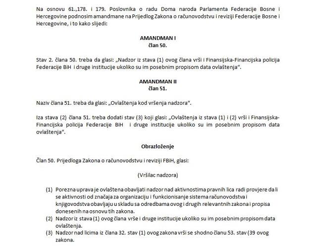 “Radi se o vrlo zahtjevnim i brojnim aktivnostima koje Porezna uprava Federacije BiH, iako je i po trenutno važećem Zakonu o računovodstvu i reviziji bila ovlaštena za njihovo preduzimanje, iste nije provodila, odnosno nije implementirala u praksi. Naime, Porezna uprava Federacije BiH je vršila samo nadzor nad uspostavljanjem sistema računovodstva i knjigovodstva, uz neke izuzetke, dok je nadzor i kontrolu nad ostalim odredbama Zakona o računovodstvu i reviziji vršila Finansijska policija Federacije BiH”, navodi se u obrazloženju amandmana.