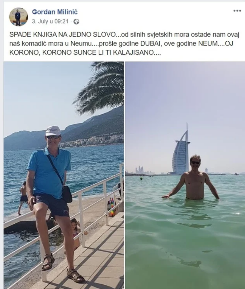 “Od silnih svjetskih mora ostade nam ovaj naš komadić mora u Neumu… Prošle godine Dubai, ove godine Neum. Oj korono, korono sunce li ti kalajisano”, napisao je Milinić.
