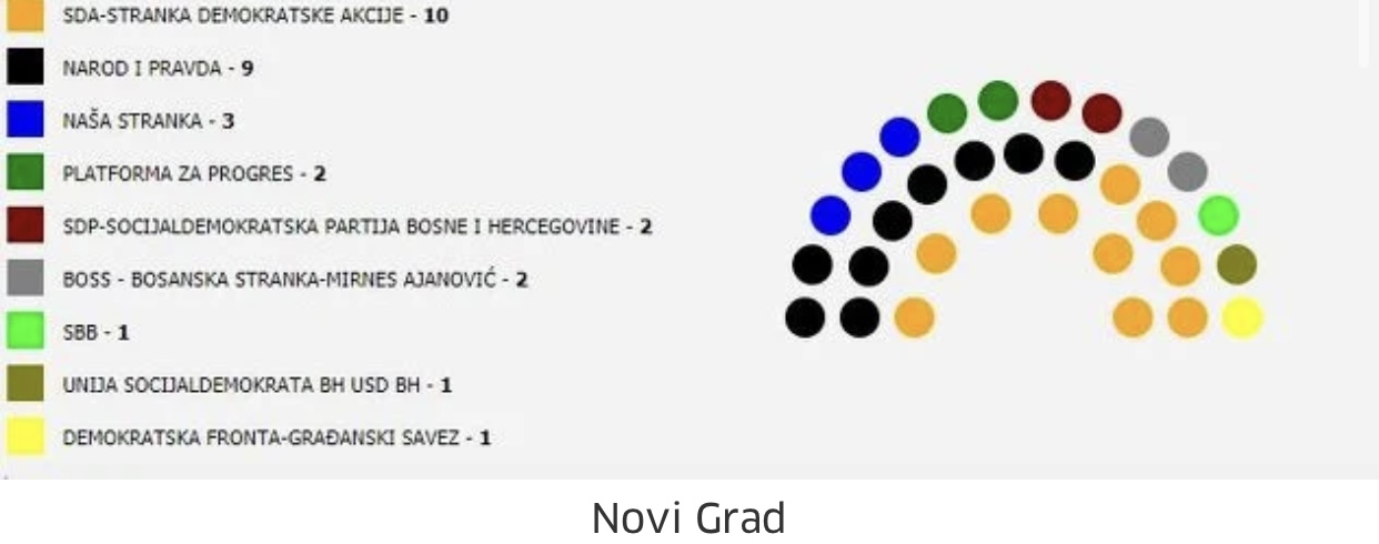 Čak devet svojih ljudi u Vijeću Novog Grada će imati Narod i pravda, a Naša stranka je izgubila jednog, tako da će imati tri. Po dva vijećnika imaju Platforma za progres, SDP i BOSS, a SBB i Unija socijaldemokrata po jednog. SBB je tako izgubio dva vijećnika, a SDP jednog.