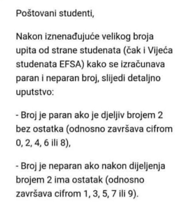 “Nakon iznenađujuće velikog broja upita studenata (čak i Vijeća studenata) kako se izračunava paran i neparan broj, slijedi detaljno uputstvo. Broj je paran ako je djeljiv brojem 2 bez ostatka (odnosno završava cifrom 0, 2, 4, 6 ili 8). Broj ne neparan ako nakon dijeljenja brojem 2 ima ostatak (odnosno završava cifrom 1, 3, 5, 7 ili 9)”, stoji u odgovoru koji su dobili.