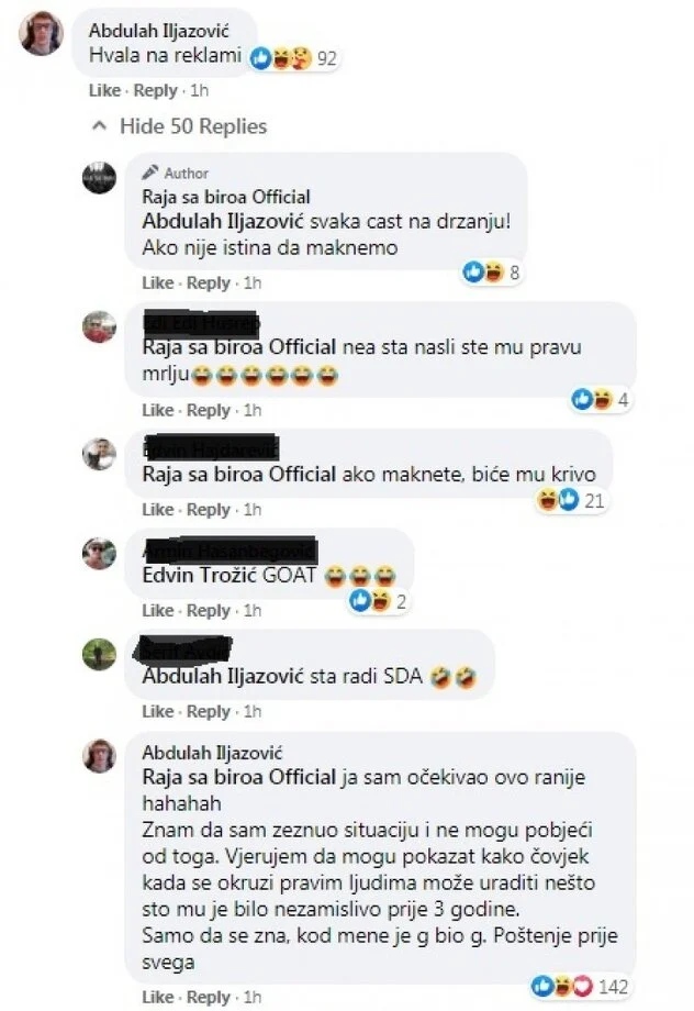 Nakon objave na stranici “Raja sa biroa”, Iljazović se zahvalio na “reklami”, a potom je obrazložio da je to očekivao i ranije.