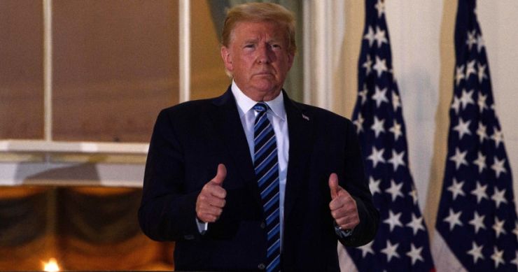 Nakon kratke vožnje bio je na travnjaku Bijele kuće, otišao na jedan od balkona, i okružen američkim zastavama skinuo masku i pozirao za kamere.