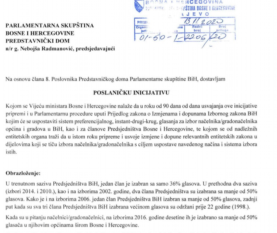 Vijeću ministara BiH upućena je inicijativa o izmjenama i dopunama Izbornog zakona BiH kojim se uspostavlja sistem prefencijalnog glasanja odnosno instant-drugi -krug za izbor načelnika ili gradonačelnika, kao i za članove Predsjedništva BiH.