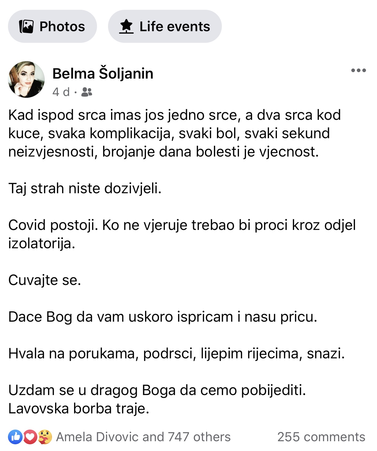 Belma je prije tri dana rodila sina, a na svom Facebook profilu objavila je i emotivan status: