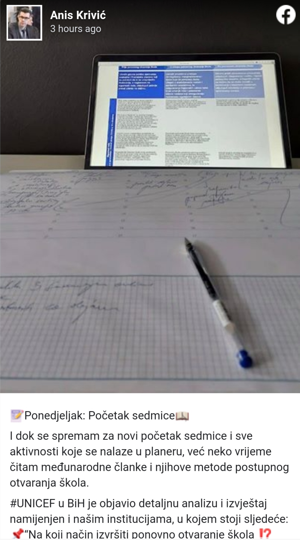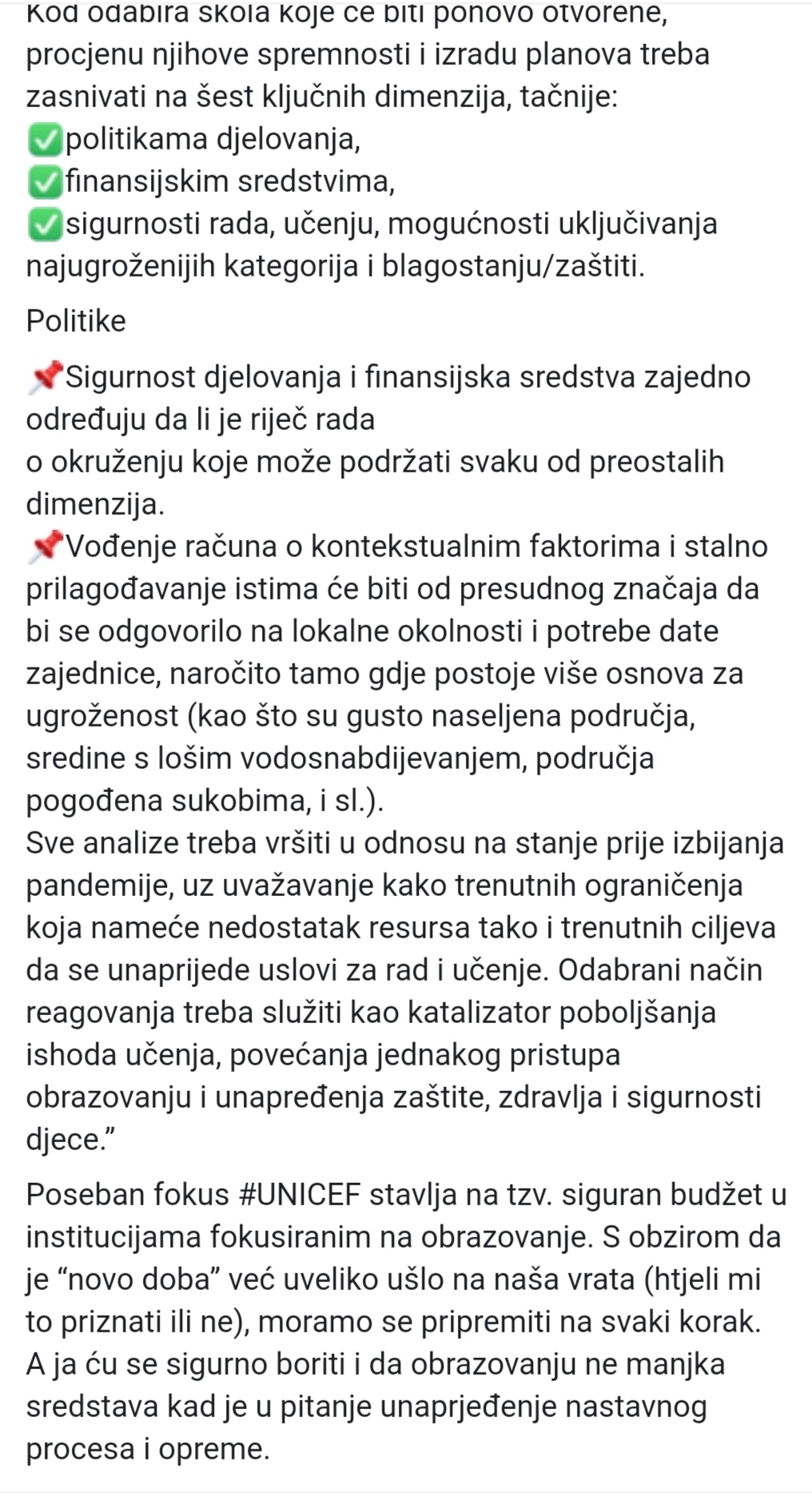 UNICEF je objavio detaljnu analizu i izvještaj o načinu pokretanja nove školske godine, a prema riječima ministra Krivića, odnosno preporukama UNICEFA, nadležni treba da osmisle plan na osnovu: politika djelovanja, finansijskih sredstava i na osnovu sigurnosti rada, učenja, mogućnosti uključivanja najugroženijih kategorija.