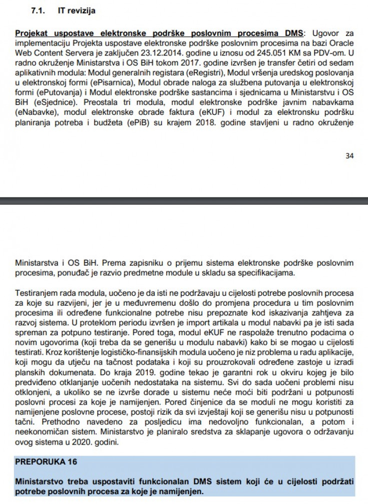 Kako su naveli državni revizori Ministarstvo još 2014. potpisalo ugovor za Projekat uspostavljanja elektronske podrške poslovnim procesima (DMS), vrijedan 245.000 KM.