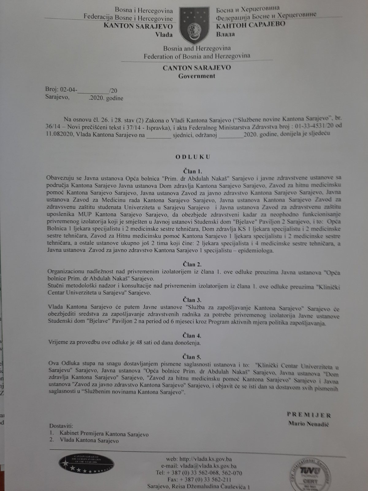 Novoformirani izolatorij koji je smješten u prostorijama studentskog centra na Bjelavama sve su prilike da je nakon današnjeg sastanka dobio saglasnost za rad Federalnog ministra zdravstva Vjekoslava Mandića, čime su ispunjeni pravni uvjeti za funkcionisanje ovog izolatorija.