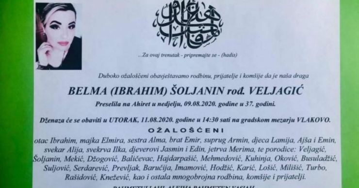 Dženaza i ukop 37-godišnje Belme Šoljanin, direktorice Instituta za majku i dijete, obavit će se danas na Gradskom mezarju Vlakovo.
