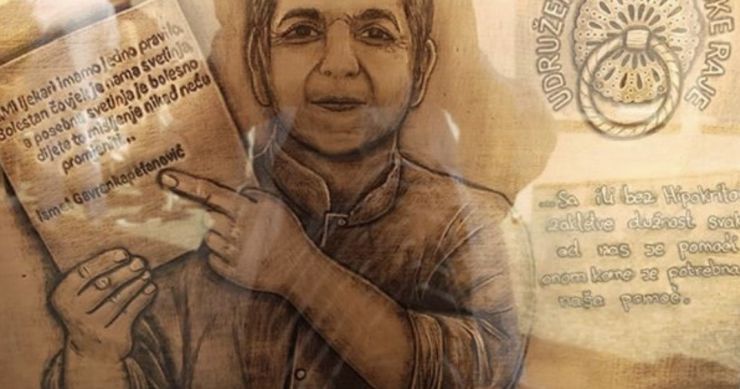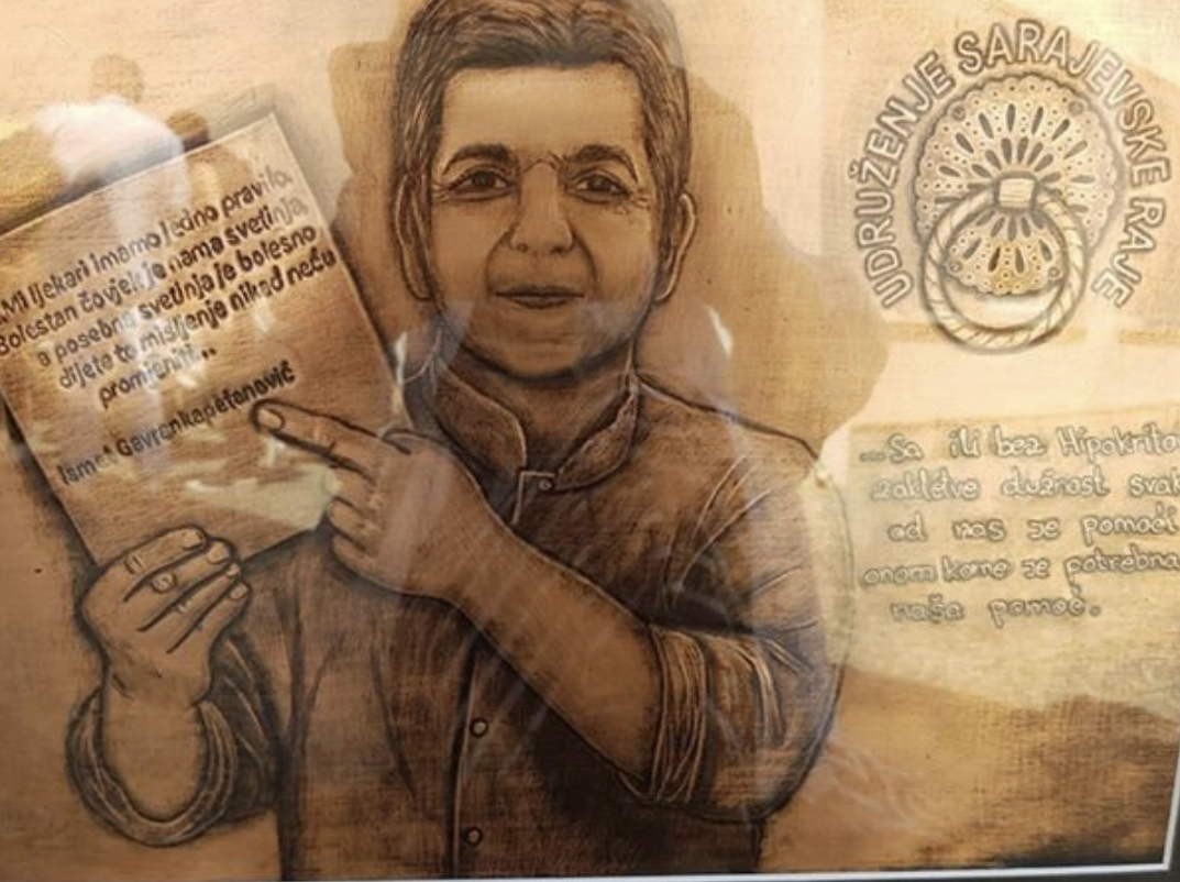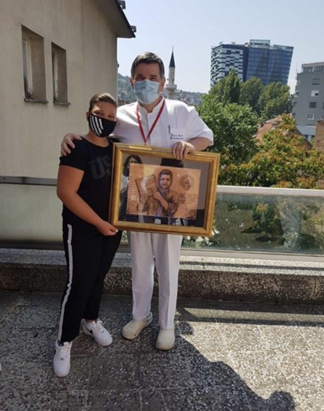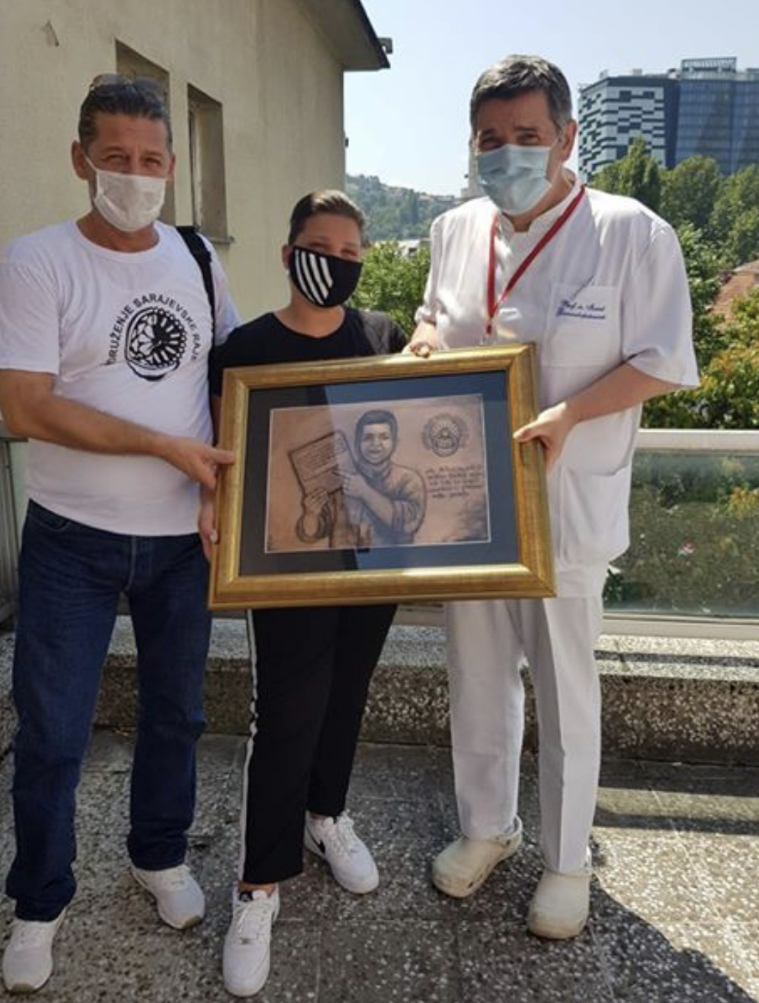 Predsjednik Udruženja Sarajevska Raja Nedim Ramic i djevojčica koja je postala simbol borbe za život protiv zdrasvtveng sistema koji ubija, Nadin Smajlović, uručili su sliku zahvalnosti i podrške profesoru Ismetu Gavrankapetanoviću.