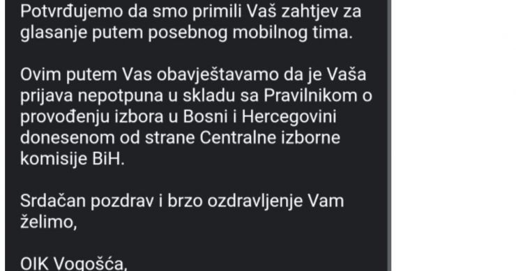 Naime, obratila sam se 11. OIK Vogošća da se nalazim u samoizolaciji sa svojim podacima i da čekam rezultate testiranja, te da želim da izađe mobilni tim kako bih mogla glasati jer mi je doktor otvorio samoizolaciju. Poslali su mi uputstvo tražeći ili nalaz sa pozitivnim rezultatom ili da dostavim rješenje o samoizolaciji. Jutros sam dostavila za sebe i svoje roditelje anketni upitnik izdat od strane Doma zdravlja Vogošća, sa pečatom, na kojem je navedeno da sam COVID pozitivna te da se moji roditelji nalaze u samoizolaciji, ponovno tražeći da izađe mobilni tim kako bismo mogli glasati. Večeras mi je stigao mail od OIK Vogošća u kojem navode da nas odbijaju za izlazak mobilnog tima zbog “nepotpune prijave”.