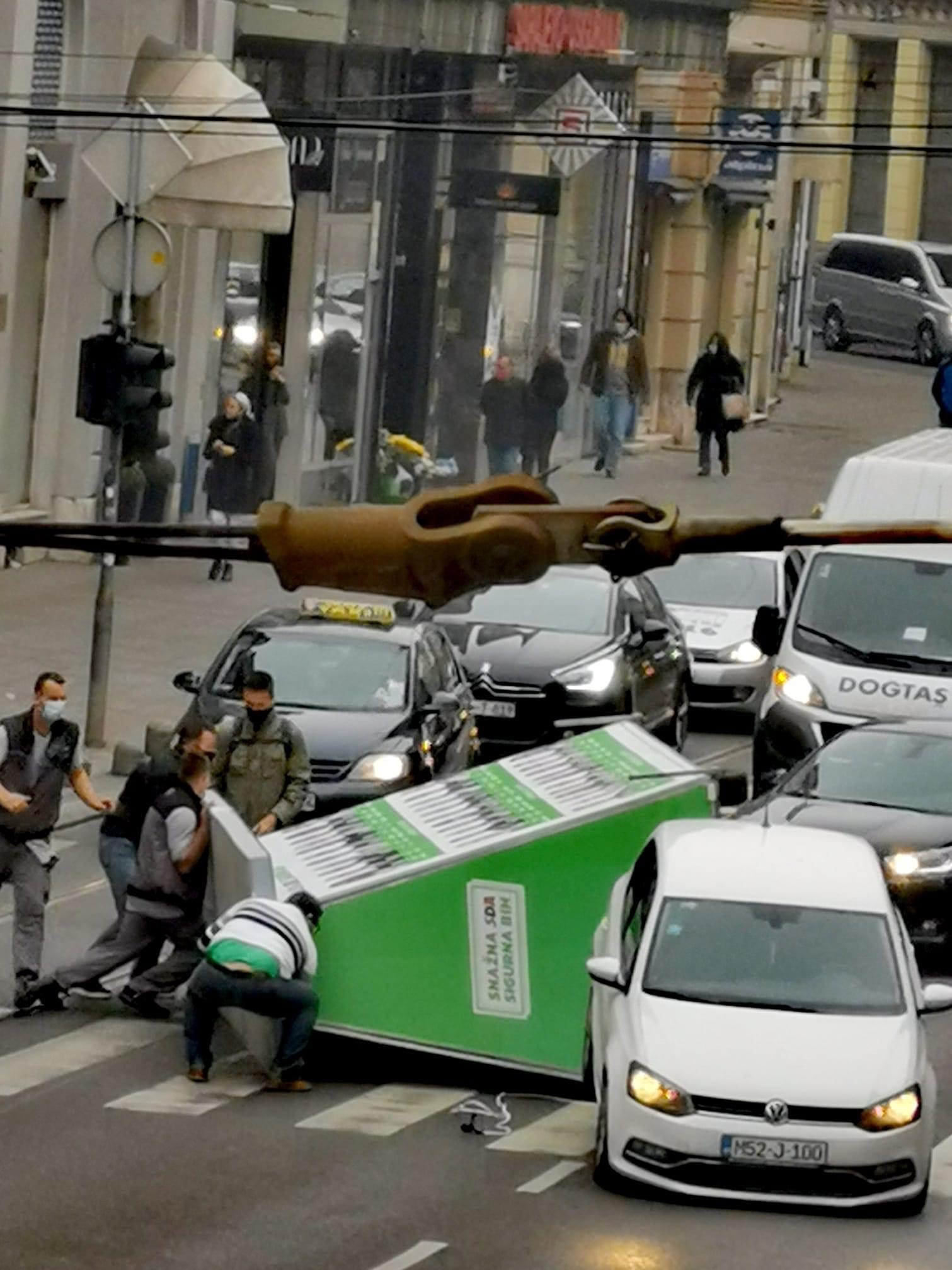 Saobraćajna nesreća desila se na pješačkom prijelazu u ulici Maršala Tata na dijelu od raskrsnice sa ulicom Dalmatinska i to nakon što se SDA prikolica, prikačena na vozilo marke Golf, prevrnula.