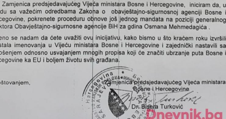 “Kao zamjenica predsjedatelja Vijeća ministara BiH, iniciram da se u skladu sa važećim odredbama Zakona o OSA BiH pokrenete proceduru obnove još jednog mandata na poziciji generalnog direktora OSA BiH za gdina Mehmedagića”.