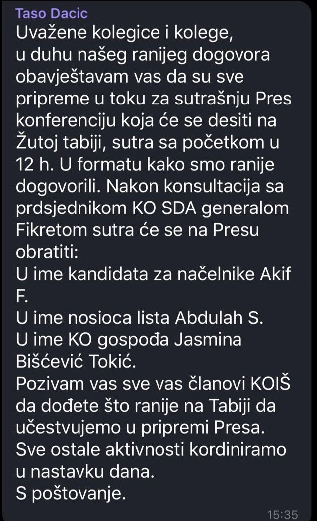 Na koju profesionalnu mjeru je rukovodstvo SDA dovelo KO SDA Sarajevo, najbolje govori poziv za press “šefa” izbornog štaba Tase Dacića.