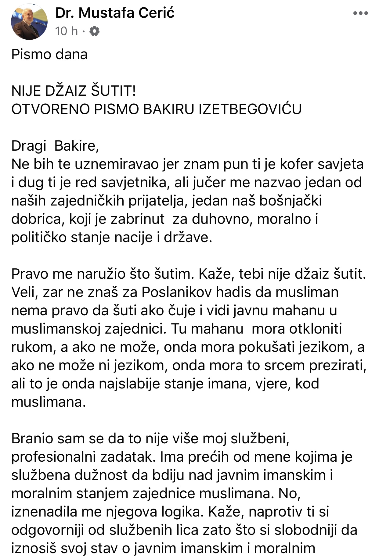 Mustafa Cerić, nekadašnji reis, objavio je na svom Facebook profilu otvoreno pismo predsjedniku SDA, Bakiru Izetbegoviću. Pismo se odnosi na slučaj o kojem već danima broji bh. javnost, slučaj dr. Ismeta Gavrankapetanovića.