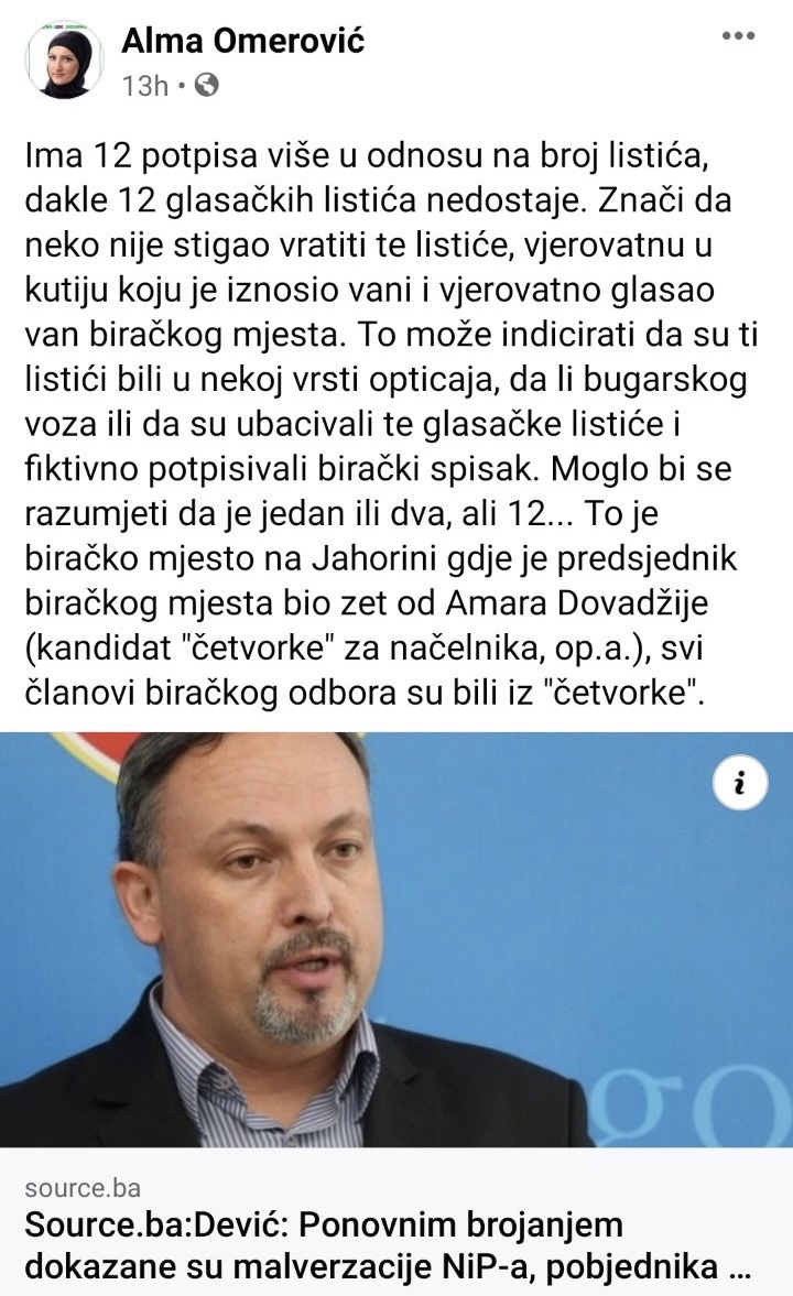 U svom Facebook statusu stala je u odbranu svog omiljenog predsjednika Devića nositeljica liste Alma Omerović i ustvrdila laž, a to je da su svi članovi biračkog odbora na ovom biračkom mjestu bili iz reda “Četvorke”, a u laži su kratke noge.