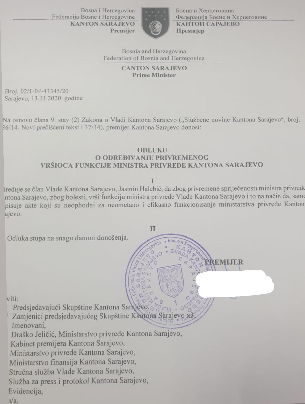 Najsvježije imenovani vd je onaj za poziciju ministra privrede. Naime umjesto Draška Jeličića, premijer Kantona Sarajevo Mario Nenadić imenovao je na ovu poziciju za vd-a ministra finansija Jasmina Halebića.