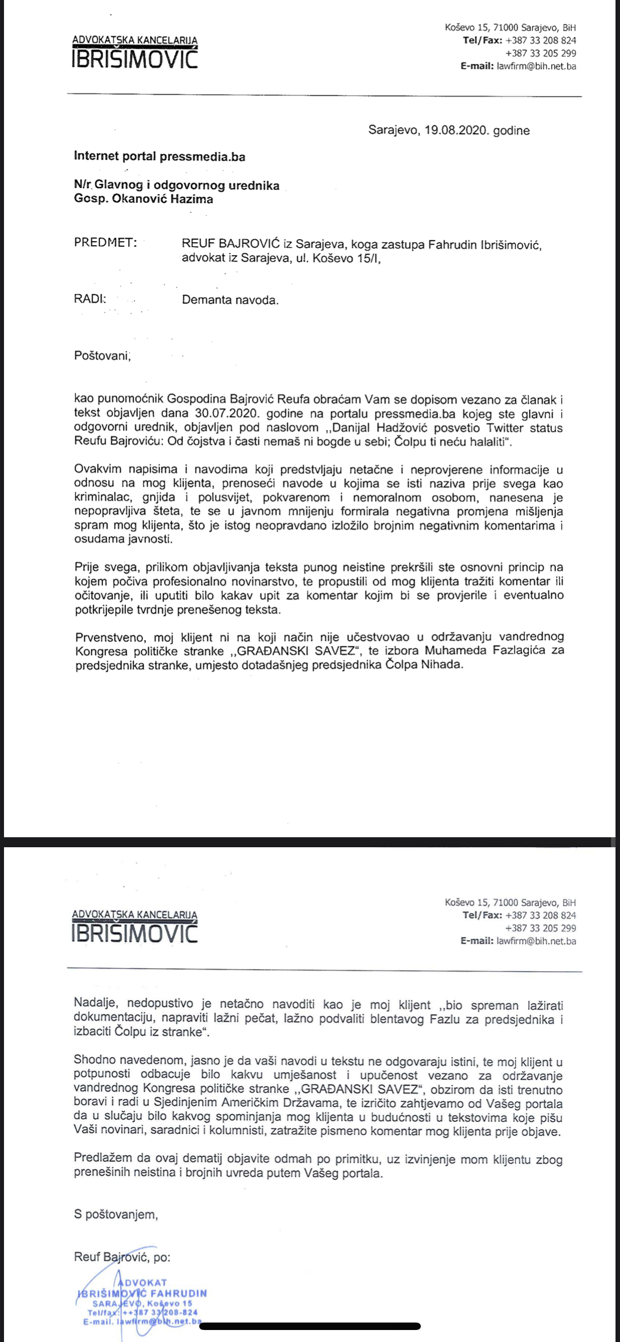 Povodom teksta kojim je PRESS u rubrici “Na mreži” prenio navode koji se odnose na Reufa Bajrovića, prenosimo demant upućen od strane njegovog advokata u cjelosti: